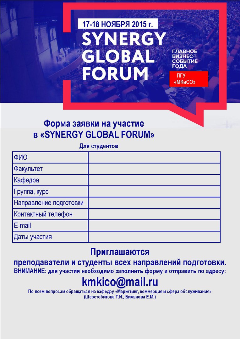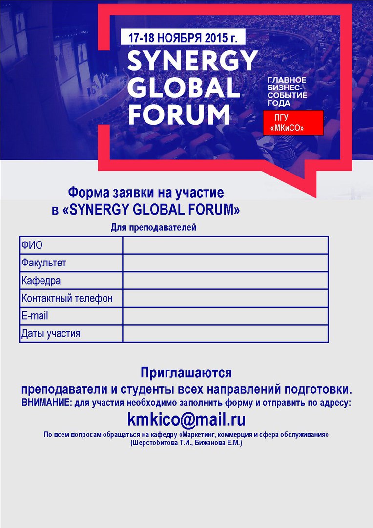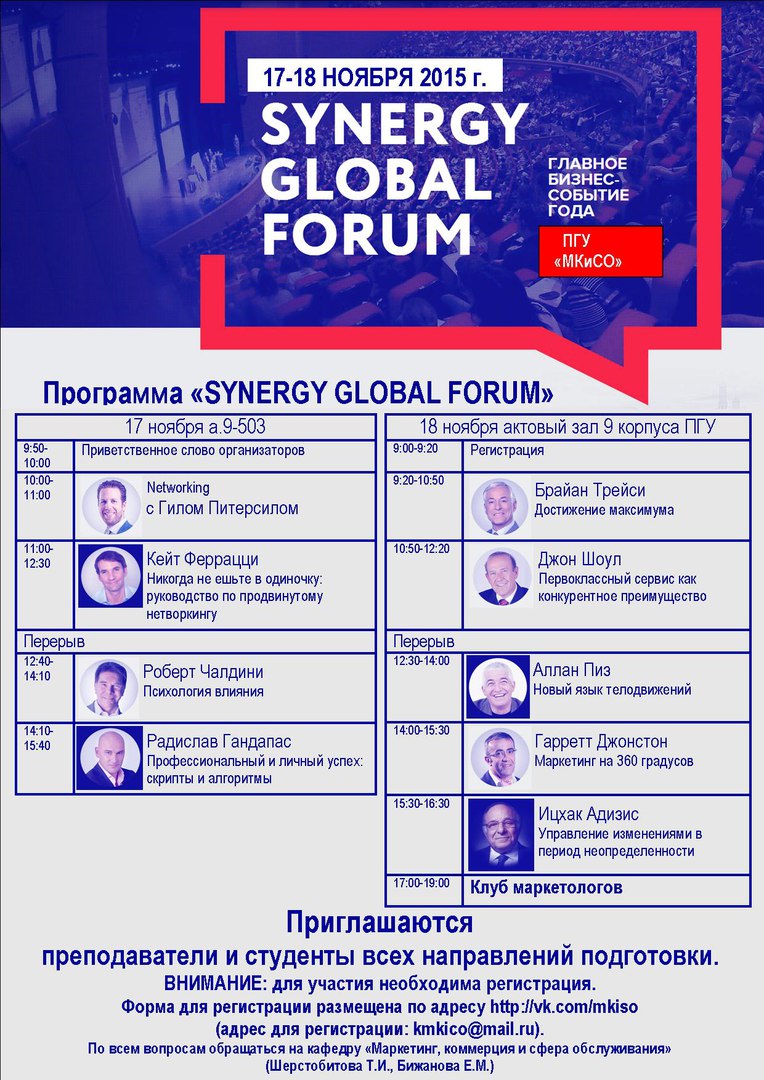 » Новости » Кафедра "Маркетинг, коммерция и сфера обслуживания" приглашает всех заинтересованных принять участие в "Synergy global forum" 17-18 ноября 2015 г.
